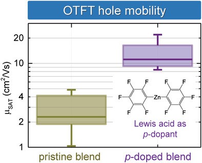 Incorporating the molecular organic Lewis acid tris(pentafluorophenyl)borane [B(C6F5)3] into organic semiconductors has shown remarkable promise in recent years for controlling the operating characteristics and performance of various opto/electronic devices, including, light-emitting diodes, solar cells, and organic thin-film transistors (OTFTs). Despite the demonstrated potential, however, to date most of the work has been limited to B(C6F5)3 with the latter serving as the prototypical air-stable molecular Lewis acid system. Herein, the use of bis(pentafluorophenyl)zinc [Zn(C6F5)2] is reported as an alternative Lewis acid additive in high-hole-mobility OTFTs based on small-molecule:polymer blends comprising 2,7-dioctyl[1]benzothieno [3,2-b][1]benzothiophene and indacenodithiophene–benzothiadiazole. Systematic analysis of the materials and device characteristics supports the hypothesis that Zn(C6F5)2 acts simultaneously as a p-dopant and a microstructure modifier. It is proposed that it is the combination of these synergistic effects that leads to OTFTs with a maximum hole mobility value of 21.5 cm2 V−1 s−1. The work not only highlights Zn(C6F5)2 as a promising new additive for next-generation optoelectronic devices, but also opens up new avenues in the search for high-mobility organic semiconductors.