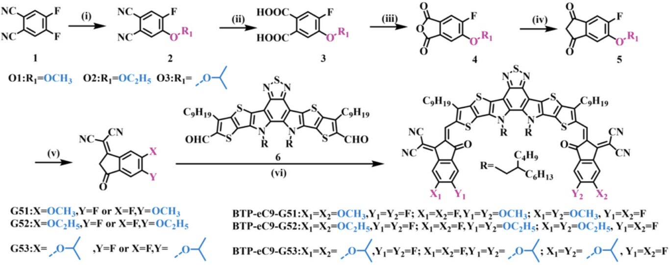 Y-series nonfullerene acceptors (NFAs) usually bear halogenated end groups to achieve narrow bandgaps and tunable molecules crystallinity; however, it results in small open-circuit voltage (Voc) of 0.8–0.9 V. Here, three Y-series NFAs BTP-eC9-G51, BTP-eC9-G52, and BTP-eC9-G53 are synthesized by introducing both an electron-withdrawing fluoro group and electron-donating alkoxy group to commonly used 2-(3-oxo-2,3-dihydroinden1-ylidene)-malononitrile (IC) terminal groups. These compounds demonstrate a high Voc larger than 0.9 V when employed as acceptors in organic solar cells (0.91 V for BTP-eC9-G51 and 0.95 V for the others). The effect of alkoxy chain length of the molecules on the photoelectric properties is systematically studied. The results show that the dipole moments and aggregation behaviors of these molecules changes obviously with the increase of alkoxy chain length. The active layer based on BTP-eC9-G51 shows suitable phase separation structure and good charge transport. Devices based on BTP-eC9-G51 achieve a device efficiency of 16.65%, higher than those of BTP-eC9-G52 and BTP-eC9-G53 based devices (14.33% and 13.24%, respectively). Furthermore, BTP-eC9-G51 is introduced into D18:L8-BO devices as a third component, which improves the Jsc and Voc, reduces the nonradiation energy loss, and the device efficiency is increased to 19.03% with a high Voc of 0.92 V.