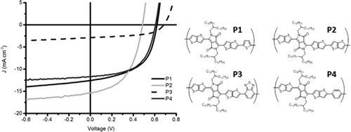 The synthesis and characterization of four new donor–acceptor type semiconducting polymers based on the electron-deficient diketopyrrolopyrrole unit for use in photovoltaic devices are reported. The extended 2-decyl-1-tetradecyl alkyl chain (C10C12) is utilized to provide a valuable route toward enhanced solubility. The resultant soluble DPP polymers were synthesized in high polymer molecular weights with a larger range of accessible comonomer units. Bulk heterojunction solar cells containing these polymers show promising device performance with efficiencies around 4%. Organic thin film transistor devices with high ambipolar hole mobilities of >0.1 cm2 V–1 s–1 are also reported.