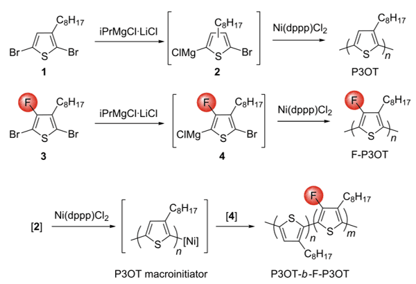 The microstructure of the active blend layer has been shown to be a critically important factor in the performance of organic solar devices. Block copolymers provide a potentially interesting avenue for controlling this active layer microstructure in solar cell blends. Here we explore the impact of backbone fluorination in block copolymers of poly(3-octyl-4-fluorothiophene)s and poly(3-octylthiophene) (F-P3OT-b-P3OT). Two block co-polymers with varying block lengths were prepared via sequential monomer addition under Kumada catalyst transfer polymerisation (KCTP) conditions. We compare the behavior of the block copolymer to that of the corresponding homopolymer blends. In both types of system, we find the fluorinated segments tend to dominate the UV–visible absorption and molecular vibrational spectral features, as well as the thermal behavior. In the block copolymer case, non-fluorinated segments appear to slightly frustrate the aggregation of the more fluorinated block. However, in situ temperature dependent Raman spectroscopy shows that the intramolecular order is more thermally stable in the block copolymer than in the corresponding blend, suggesting that such materials may be interesting for enhanced thermal stability of organic photovoltaic active layers based on similar systems.