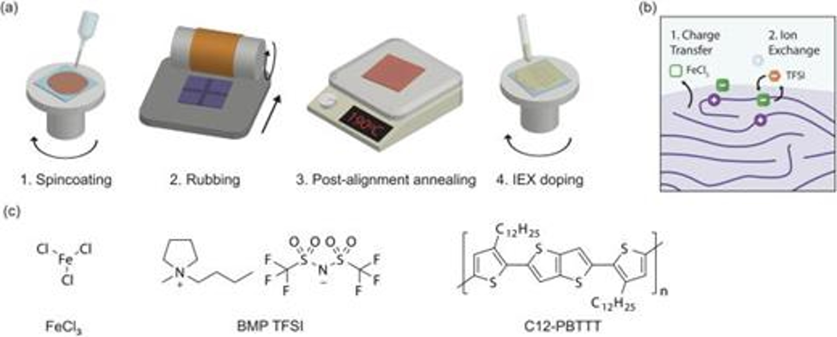 Organic thermoelectrics offer the potential to deliver flexible, low-cost devices that can directly convert heat to electricity. Previous studies have reported high conductivity and thermoelectric power factor in the conjugated polymer poly[2,5-bis(3-tetradecylthiophen-2-yl)thieno[3,2-b]thiophene] (PBTTT). Here, we investigate the thermoelectric properties of PBTTT films in which the polymer chains were aligned uniaxially by mechanical rubbing, and the films were doped by a recently developed ion exchange technique that provides a choice over the counterions incorporated into the film, allowing for more optimized morphology and better stability than conventional charge transfer doping. To optimize the polymer alignment process, we took advantage of two Design of Experiment (DOE) techniques: regular two-level factorial design and central composite design. Rubbing temperature Trub and post-alignment annealing temperature Tanneal were the two factors that were most strongly correlated with conductivity. We were able to achieve high polymer alignment with a dichroic ratio >15 and high electrical conductivities of up to 4345 S/cm for transport parallel to the polymer chains, demonstrating that the ion exchange method can achieve conductivities comparable/higher than conventional charge transfer doping. While the conductivity of aligned films increased by a factor of 4 compared to unaligned films, the Seebeck coefficient (S) remained nearly unchanged. The combination of DOE methodology, high-temperature rubbing, and ion exchange doping provides a systematic, controllable strategy to tune structure–thermoelectric property relationships in semiconducting polymers.