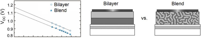 To understand the limitations placed on the open-circuit voltage of bulk heterojunction (BHJ) organic solar cells, the energy levels of neat donor and acceptor samples are often characterized and applied to study BHJ blends. However, energy levels derived from neat samples may not necessarily reflect those at the donor:acceptor interface in blends. The properties of organic semiconductors are sensitive to microstructural changes, with non-fullerene acceptors (NFAs) in particular known to exhibit different thin-film polymorphs. To investigate the influence of differences in molecular packing in neat and blend films, temperature-dependent current–voltage characteristics are measured for bilayer (BL) and BHJ devices. Herein, the fullerene acceptor PC71BM is compared—whose energy levels are expected to be less sensitive to molecular packing—with the NFA ITIC, paired with the same donor polymer PTB7-Th. It is found that the interfacial energy levels differ for BL and BHJ devices for the PTB7-Th:ITIC system but remain the same for the PTB7-Th:PC71BM system. Furthermore, X-ray scattering measurements identify that ITIC exhibits a different packing mode in neat films and in BHJ blends. Such microstructure-dependent differences between neat and blend samples need to be considered when studying energy losses in NFA BHJ solar cells.