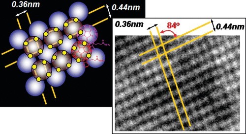 We found that 1-(3-methoxycarbonyl)propyl-1-phenyl-(6,6)C61 (PCBM) molecules make a distorted asymmetric body-centered cubic crystal nanostructure in the bulk heterojunction films of reigoregular poly(3-hexylthiophene) and PCBM. The wider angle of distortion in the PCBM nanocrystals was ∼96°, which can be assigned to the influence of the attached side group to the fullerene ball of PCBM to bestow solubility. Atom concentration analysis showed that after thermal annealing the PCBM nanocrystals do preferentially distribute above the layer of P3HT nanocrystals inside devices.