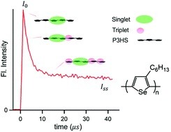 Triplet formation and interactions with emissive singlet excitons are investigated in poly(3-hexylselenophene) (P3HS) using single molecule spectroscopy. P3HS is a heavy atom analog of the more commonly studied poly(3-hexylthiophene) (P3HT), a benchmark polymer for solar cells. P3HS tends to aggregate strongly which necessitates dilution to ultra-low levels within a solid inert host in order to resolve photophysical responses of single chains. Fluorescence excitation intensity modulation is performed on isolated P3HS chains using a sequence of rectangular pulses of varying intensities to probe the presence of spin-forbidden triplet excitons. Triplet population dynamics originating from singlet–triplet and triplet–triplet interactions appear as quenching of the initial fluorescence intensity to steady-state levels on characteristic time scales of ∼1–10 μs. Over 80% of all molecules studied display significant fluorescence intensity modulation (quenching depths >50%) indicative of efficient intersystem crossing and large triplet occupancies. Because triplets are highly localized and singlet–triplet and triplet–triplet annihilation rate constants are comparable to those of intersystem crossing, multiple triplets are present at any given time on single P3HS chains. Triplet lifetimes were estimated to be ∼4 μs (upper limit) determined from recovery to the ground electronic singlet state in the absence of light and, surprisingly, triplets vanish at the onset of P3HS aggregation. This result was unexpected since P3HS triplet formation takes place on time scales <30 ps making this process competitive with most accessible non-radiative deactivation pathways.