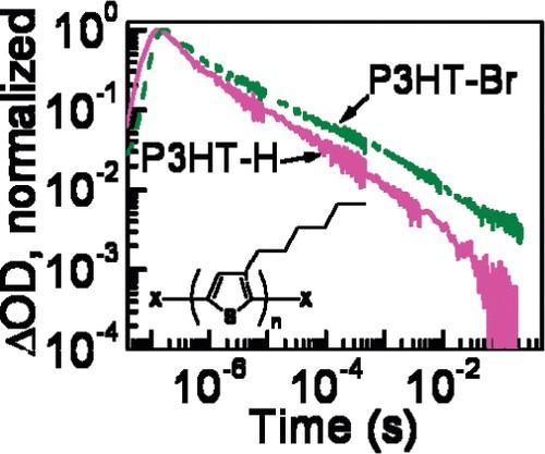 In this report, we have studied the influence of the nature of the end groups (bromine or hydrogen) of regioregular poly(3-hexylthiophene) (P3HT) polymers on the performance of polymer solar cells made with blend films of P3HT and 1-(3-methoxycarbonyl)-propyl-1-phenyl-(6,6)C61 (PCBM). Films and devices were studied before and after annealing at 140°C for 2 h. The effects of the end-group type on the properties of pristine polymers and blend films were examined using optical absorption and emission spectroscopy, transient absorption spectroscopy, and measurements of photovoltaic device performance. It was observed that hydrogen end groups result in slightly higher absorption coefficients, higher photoluminescence intensities, faster and less dispersive charge recombination, and superior solar cell performance (notably a higher fill factor) compared to bromine end groups. The results are attributed to more-ordered polymer-chain packing in blend films made with hydrogen-capped P3HT, on account of the smaller size and weaker electrostatic interactions resulting from hydrogen compared to bromine. Some influence of the C - Br group on exciton quenching may also be present. The effect of the bromine end group on solar-cell performance became more pronounced with reducing incident-light intensity. Comparison of the polymer transport characteristics in organic field-effect transistor configuration indicated that the bromine end group enhances hole trapping. © 2007 American Chemical Society.