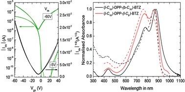 In this article we discuss the synthesis of four new low band-gap co-polymers based on the diketopyrrolopyrrole (DPP) and benzotriazole (BTZ) monomer unit. We demonstrate that the BTZ unit allows for additional solubilizing side-chains on the co-monomer and show that the introduction of a linear side-chain on the DPP-unit leads to an increase in thin-film order and charge-carrier mobility if a sufficiently solubilizing, branched, side chain is attached to the BTZ. We compare two different synthetic routes, direct arylation and Suzuki-polycondensation, by a direct comparison of polymers obtained via the two routes and show that direct arylation produces polymers with lower electrical performance which we attribute to a higher density of chain Furthermore we demonstrate that a polymer utilizing this design motif and synthesized via Suzuki-polycondensation ((l-C18)-DPP-(b-C17)-BTZ) exhibits exceptionally high and near balanced average electron and hole mobilities >2 cm2 V−1 s−1 which are among the highest, robustly extracted mobility values reported for DPP copolymers in a top-gate configuration to date. Our results demonstrate clearly that linear side chain substitution of the DPP unit together with co-monomers that allow for the use of sufficiently long or branched solubilizing side chains can be an attractive design motif for solution processable, high mobility DPP copolymers.