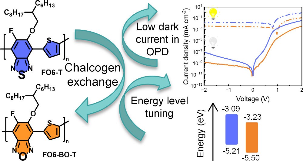 The performance of organic photodetectors (OPDs) using conjugated polymer donors and molecular acceptors has improved rapidly, but many polymers are difficult to upscale due to their complex structures. This study examines two low-complexity thiophene copolymers with substituted benzooxadiazole (FO6-BO-T) or benzothiadiazole (FO6-T). Substituting sulfur with oxygen in FO6-BO-T increased its ionization energy without affecting the optical gap. When blended with the nonfullerene acceptor IDSe, FO6-BO-T showed a significantly lower dark current density (2.06·10–9 A cm–2 at −2 V) compared to FO6-T. Grazing incidence wide-angle X-ray scattering (GIWAXS) measurements demonstrated that pristine FO6-BO-T exhibited a more ordered morphology than FO6-T. However, blending resulted in a significant disruption to the ordered domains in both cases, with a loss of orientational order, suggesting that FO6-BO-T’s improved performance is largely related to its increased ionization energy. This study demonstrates the potential of chalcogen atom engineering to enhance the performance of the OPD in scalable polymers.