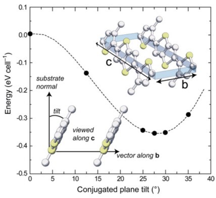 The structure within crystalline thin films of a high-carrier-mobility polythiophene is studied with complementary characterization methods and first-principles theory. As shown in the figure, two important structural aspects are revealed: 1) a slip in the face-to-face π-π packing, which strongly influences carrier mobility, and 2) the interdigitation of highly trans side chains between vertically adjacent lamellae.