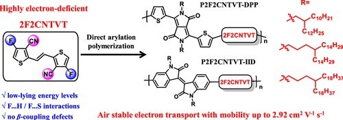 A highly electron-deficient building block, (E)-2,2′-(ethene-1,2-diyl)bis(4-chlorothiophene-3-carbonitrile) (2F2CNTVT), was designed and synthesized by the introduction of fluorine and cyano groups simultaneously onto the β position of thiophene units in (E)-1,2-di(thiophen-2-yl)ethene (TVT). A series of conjugated copolymers with different alkyl side chains were successfully synthesized via direct arylation polymerization (DArP) of 2F2CNTVT with thiophene-flanked diketopyrrolopyrrole (DPP) or isoindigo (IID) monomers. The resulting polymers exhibited improved planarity due to intramolecular or intermolecular F···S or F···H weak interactions and low-lying energy levels to realize stable and unipolar electron transport in organic thin film transistors (OTFTs). The microstructure and electrical performance of the polymers were confirmed to be dependent on the length of the side chains. Containing the longest side chains, P2F2CNTVT–DPP-3 and P2F2CNTVT–IID-3 displayed relatively higher μe of 2.03 and 2.92 cm2 V–1 s–1 with on/off ratios of up to 105–106, respectively, which was related to the favorable alignment of polymer chains for lower paracrystallinity and more ordered transport channels. Furthermore, the high-mobility OTFTs showed good air stability after a 1 month exposure to an ambient atmosphere due to their sufficiently low-lying LUMO levels. Our strategy of combining both F and CN groups in the same unit demonstrated its potential for high-performance n-type OTFT materials and can be extended to the design of new electron-deficient building blocks.