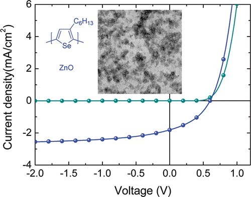Regioregular poly(3-hexylselenophene) (P3HS) is used in combination with zinc oxide (ZnO) to make hybrid polymer–metal oxide solar cells with a photoresponse up to 740 nm. Intimately mixed ZnO:P3HS layers were prepared by casting P3HS and diethylzinc as a reactive precursor from a common solvent in a moist atmosphere, followed by conversion to ZnO in the film. Photoinduced absorption spectroscopy was used to identify the electron transfer reaction occurring from P3HS to ZnO under illumination. The performance of ZnO:P3HS solar cells was optimized for composition, layer thickness, and conversion temperature to a final power conversion efficiency of 0.4% in simulated solar light. The performance is primarily limited by a low short-circuit current. By comparing the spectrally resolved external quantum efficiency with the optical absorption, we find that the abundant semicrystalline phase of P3HS gives a negligible contribution to the photocurrent, which is dominated by the scarce amorphous P3HS regions in direct contact with the ZnO.