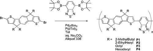 We have studied how the OFET and OPV performance of a donor–acceptor IDT–BT type polymer is affected by the variation of the solubilizing alkyl chains. For OFETs, a very long linear chain is most beneficial, as this results in the most aggregated solid-state structure (as observed by an increasing amount of a shoulder in the thin film UV–vis spectra). However, extremely high mobilities are also observed in polymers with shorter bulky side chains, which challenges the notion that long linear chains are a necessity in high charge carrier mobility materials. In terms of OPV performance, ethylhexyl side chains lead to very desirable phase separation in this polymer class (as observed by AFM) and extremely good device PCEs. Even shorter and bulkier side chains result in the formation of PCBM crystallites, whereas a long linear chain results in large domains. Further solid-state analysis of the interaction between the polymer side chains and the fullerene acceptor is ongoing and will be presented separately.