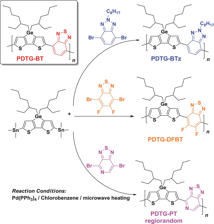 A series of donor–acceptor (D–A) conjugated polymers utilizing 4,4-bis(2-ethylhexyl)-4H-germolo[3,2-b:4,5-b′]dithiophene (DTG) as the electron rich unit and three electron withdrawing units of varying strength, namely 2-octyl-2H-benzo[d][1,2,3]triazole (BTz), 5,6-difluorobenzo[c][1,2,5]thiadiazole (DFBT) and [1,2,5]thiadiazolo[3,4-c]pyridine (PT) are reported. It is demonstrated how the choice of the acceptor unit (BTz, DFBT, PT) influences the relative positions of the energy levels, the intramolecular transition energy (ICT), the optical band gap (Egopt), and the structural conformation of the DTG-based co-polymers. Moreover, the photovoltaic performance of poly[(4,4-bis(2-ethylhexyl)-4H-germolo[3,2-b:4,5-b′]dithiophen-2-yl)-([1,2,5]thiadiazolo[3,4-c]pyridine)] (PDTG-PT), poly[(4,4-bis(2-ethylhexyl)-4H-germolo[3,2-b:4,5-b′]dithiophen-2-yl)-(2-octyl-2H-benzo[d][1,2,3]triazole)] (PDTG-BTz), and poly[(4,4-bis(2-ethylhexyl)-4H-germolo[3,2-b:4,5-b′]dithiophen-2-yl)-(5,6-difluorobenzo[c][1,2,5]thiadiazole)] (PDTG-DFBT) is studied in blends with [6,6]-phenyl-C70-butyric acid methyl ester (PC70BM). The highest power conversion efficiency (PCE) is obtained by PDTG-PT (5.2%) in normal architecture. The PCE of PDTG-PT is further improved to 6.6% when the device architecture is modified from normal to inverted. Therefore, PDTG-PT is an ideal candidate for application in tandem solar cells configuration due to its high efficiency at very low band gaps (Egopt = 1.32 eV). Finally, the 6.6% PCE is the highest reported for all the co-polymers containing bridged bithiophenes with 5-member fused rings in the central core and possessing an Egopt below 1.4 eV.