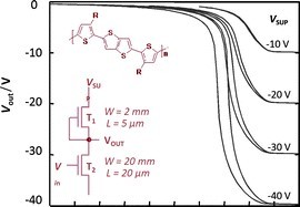 Poly(2,5-bis(3-alkylthiophen-2-yl)thieno[3,2-b]thiophenes) (pBTTTs)—currently one of the most promising class of polymer semiconductors—are known to have a low-room-temperature solubility in a broad range of common organic solvents. By judicious selection of a suitable solvent for these rigid-rod-like, liquid-crystalline materials, we ink-jet printed poly(2,5-bis(3-dodecylthiophen-2-yl)thieno[3,2-b]thiophene) (pBTTT-C12) into discrete thin-film field-effect transistors (FETs) that display on/off ratios of up to 107 and charge-carrier mobilities in the range of 0.05–0.1 cm2 V−1 s−1. Compared to spin-coated devices, the ink-jet printed devices typically had lower current leakage; indeed, gate-leakage currents were 1 to 2 orders of magnitude lower in ink-jet printed transistors. These overall device performance of ink-jet printed pBTTT-C12 would be sufficient for, for instance, driving simple electrophoretic displays [T. N. Ng, S. Sambandan, R. Lujan, A. C. Arias, C. R. Newman, H. Yan and A. Facchetti, Appl. Phys. Lett., 2009, 94, 233307; G. H. Gelinck, T. C. T. Geuns and D. M. de Leeuw, Appl. Phys. Lett., 2000, 77, 1487–1489; H. E. A. Huitema, G. H. Gelinck, J. van der Putten, K. E. Kuijk, C. M. Hart, E. Cantatore, P. T. Herwig, A. van Breemen and D. M. de Leeuw, Nature, 2001, 414, 599–599; H. E. A. Huitema, G. H. Gelinck, J. van der Putten, K. E. Kuijk, K. M. Hart, E. Cantatore and D. M. de Leeuw, Adv. Mater., 2002, 14, 1201–1204.]. We demonstrate here integration of such ink-jet printed pBTTT-C12 transistors into unipolar digital logic gates, which produced a signal gain of more than 16. This is one of the highest gains reported for a unipolar-based logic gate and demonstrates the potential of pBTTT polymers for high performance application employing simple ink-jet printing procedures conducted in light and ambient air without any special precautions.