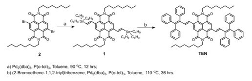 Organic conjugated materials combining high conductivity with strong solid-state emission are highly desired for organic electronic applications, yet still rather rare. Herein, a novel luminogen (TEN) comprised by linking naphthalene diimides and tri-phenyl ethylene with vinyl bridges is reported. TEN exhibits aggregation-induced emission (AIE) behavior of a strong near-infrared fluorescence over 700 nm and the efficiency above 60.5% in the solid state, while also shows promising application in vivo bio-imaging with good permeability and extremely low background. Single crystal of TEN reveals intra- and intermolecular C-H⋯O hydrogen bonds, contributing to an inclined molecular stacking along the a-axis of the cell, creating a 1D charge carrier transporting channel under a short π-π interaction distance of 3.42 Å, which might benefit the solid emission and charge transport ability simultaneously. Solution processed bottom contact, top gate organic field effect transistors based on TEN reveal a high ambipolar charge transport ability with the hole mobility up to 0.13 cm2 V−1 s−1 and electron mobility up to 0.010 cm2 V−1 s−1. Further atomic force microscopy and X-ray diffraction analysis on TEN thin film confirm the existence of the 1D π-π stacking channel, suggesting the stacking geometry revealed in crystal crucial for facilitating high charge carrier mobility while preserving the strong solid emission at the same time.