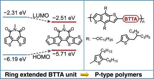 Bisthienoazepinedione (BTA) has been reported for constructing high-performing p-type conjugated polymers in organic electronics, but the ring extended version of BTA is not well explored. In this work, we report a new synthesis of a key building block to the ring expanded electron-deficient pentacyclic azepinedione (BTTA). Three copolymers of BTAA with benzodithiophene substituted by different side chains are prepared. These polymers exhibit similar energy levels and optical absorption in solution and solid state, while significant differences are revealed in their film morphologies and behavior in transistor and photovoltaic devices. The best-performing polymers in transistor devices contained alkylthienyl side chains on the BDT unit (pBDT-BTTA-2 and pBDT-BTTA-3) and demonstrated maximum saturation hole mobilities of 0.027 and 0.017 cm2 V–1 s–1. Blends of these polymers with PC71BM exhibited a best photovoltaic efficiency of 6.78% for pBDT-BTTA-3-based devices. Changing to a low band gap non-fullerene acceptor (BTP-eC9) resulted in improved efficiency of up to 13.5%. Our results are among the best device performances for BTA and BTTA-based p-type polymers and highlight the versatile applications of this electron-deficient BTTA unit.