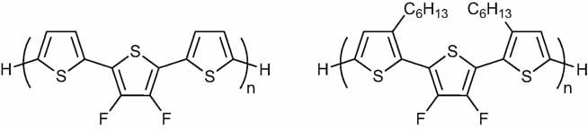 Two terthiophenes bearing core fluorinated thienyl units have been synthesised as potential semiconductor materials for organic field-effect transistors. Polymerisation of these compounds has been achieved using conventional iron(III) chloride oxidative coupling methods and by electrochemical oxidation. Characterisation of the fluorinated materials has been achieved by absorption spectroscopy and cyclic voltammetry. A soluble hexyl-functionalised polymer (poly8b) was used in an OFET device; hole mobilities were measured up to 3 × 10−3 cm2 · V−1 · s−1, and the device had an on/off ratio of 105 and a turn-on voltage of +4 V.