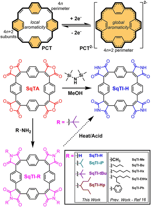 Locally aromatic alkyl-N-substituted squarephaneic tetraimide (SqTI) conjugated macrocycles are four-electron reducible, owing to global aromaticity and presumed global Baird aromaticity of the dianion and tetraanion states, respectively. However, their good solubility inhibits their application as a battery electrode material. By applying sidechain removal as a strategy to reduce SqTI solubility, we report the development of its unsubstituted derivative SqTI-H, which was obtained directly from squarephaneic tetraanhydride by facile treatment with hexamethyldisilazane and MeOH. Compared to alkyl-N-substituted SqTI-Rs, SqTI-H exhibited further improved thermal stability and low neutral state solubility in most common organic solvents, owing to computationally demonstrated hydrogen-bonding capabilities emanating from each imide position on SqTI-H. Reversible solid state electrochemical reduction of SqTI-H to the globally aromatic dianion state was also observed at −1.25 V vs. Fc/Fc+, which could be further reduced in two stages. Preliminary testing of SqTI-H in composite electrodes for lithium–organic half cells uncovered imperfect cycling performance, which may be explained by persistent solubility of reduced states, necessitating further optimisation of electrode fabrication procedures to attain maximum performance.