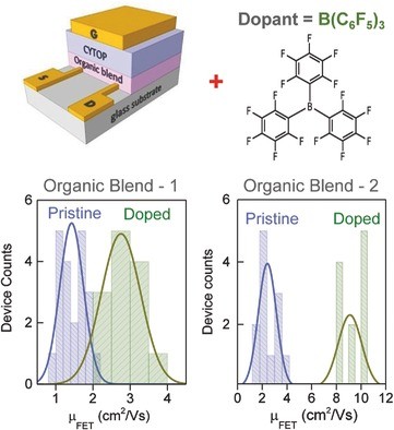 Improving the charge carrier mobility of solution-processable organic semiconductors is critical for the development of advanced organic thin-film transistors and their application in the emerging sector of printed electronics. Here, a simple method is reported for enhancing the hole mobility in a wide range of organic semiconductors, including small-molecules, polymers, and small-molecule:polymer blends, with the latter systems exhibiting the highest mobility. The method is simple and relies on admixing of the molecular Lewis acid B(C6F5)3 in the semiconductor formulation prior to solution deposition. Two prototypical semiconductors where B(C6F5)3 is shown to have a remarkable impact are the blends of 2,8-difluoro-5,11-bis(triethylsilylethynyl)anthradithiophene:poly(triarylamine) (diF-TESADT:PTAA) and 2,7-dioctyl[1]-benzothieno[3,2-b][1]benzothiophene:poly(indacenodithiophene-co-benzothiadiazole) (C8-BTBT:C16-IDTBT), for which hole mobilities of 8 and 11 cm2 V−1 s−1, respectively, are obtained. Doping of the 6,13-bis(triisopropylsilylethynyl)pentacene:PTAA blend with B(C6F5)3 is also shown to increase the maximum hole mobility to 3.7 cm2 V−1 s−1. Analysis of the single and multicomponent materials reveals that B(C6F5)3 plays a dual role, first acting as an efficient p-dopant, and secondly as a microstructure modifier. Semiconductors that undergo simultaneous p-doping and dopant-induced long-range crystallization are found to consistently outperform transistors based on the pristine materials. Our work underscores Lewis acid doping as a generic strategy towards high performance printed organic microelectronics.