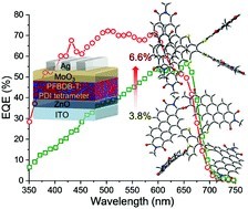 In this work, we designed and synthesized two novel perylene diimide (PDI) tetramers based on a tetrathienylethene core, named TTE-PDI4 and FTTE-PDI4, and investigated their application as non-fullerene acceptors for organic photovoltaics. The free rotation of PDIs and adjacent thiophene units renders TTE-PDI4 with a highly twisted molecular geometry. The ring fusion of TTE-PDI4 yields FTTE-PDI4, a more rigid molecule with increased intramolecular stacking. Interestingly, TTE-PDI4 and FTTE-PDI4 possess similar energy levels but very different UV-Vis absorptions, with the latter showing strong broad-band absorption with multiple sharp peaks in the 300–600 nm region. Through time-dependent density functional theory (TD-DFT) calculations, we show that this broad absorption spectrum in FTTE-PDI4 arises from the combination of multiple bright transitions in the visible region with a strong vibronic progression, tentatively assigned to the dominant CC stretching mode. TTE-PDI4, despite having a lower energy absorption onset, shows weaker absorption at long wavelengths. Due to its higher absorption as well as its increased rigidity, FTTE-PDI4 shows a higher photocurrent and hence a higher power conversion efficiency (PCE), of 6.6%, when blended with the polymer donor PFBDB-T than TTE-PDI4 based blends (PCE of 3.8%). The greater rigidity of FTTE-PDI4 is likely to contribute to the good fill factor of the blend devices. Potential for further improvement through reducing voltage losses is identified.