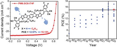 Most current highly efficient organic solar cells utilize small molecules like Y6 and its derivatives as electron acceptors in the photoactive layer. In this work, a small molecule acceptor, SC8-IT4F, is developed through outer side chain engineering on the terminal thiophene of a conjugated 6,12-dihydro-dithienoindeno[2,3-d:2′,3′-d′]-s-indaceno[1,2-b:5,6-b′]dithiophene (IDTT) central core. Compared to the reference molecule C8-IT4F, which lacks outer side chains, SC8-IT4F displays notable differences in molecule geometry (as shown by simulations), thermal behavior, single-crystal packing, and film morphology. Blend films of SC8-IT4F and the polymer donor PM6 exhibit larger carrier mobilities, longer carrier lifetimes, and reduced recombination compared to C8-IT4F, resulting in improved device performance. Binary photovoltaic devices based on the PM6:SC8-IT4F films reveal an optimal efficiency over 15%, which is one of the best values for non-Y type small molecule acceptors (SMAs). The resultant devices also show better thermal and operational stability than the control PM6:L8-BO devices. SC8-IT4F and its blend exhibit a higher relative degree of crystallinity and π coherence length, compared to C8-IT4F samples, beneficial for charge transport and device performance. The results indicate that outer side chain engineering on existing small electron acceptors can be a promising molecular design strategy for further pursuing high-performance organic solar cells.