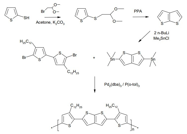 The development of p-type semiconducting polymers demonstrating good stability under ambient operation is of importance for the development of low cost, printed electronics. We present here the synthesis and full characterisation of two soluble terthiophene polymers, and examine the effect of introducing a fused aromatic heterocycle, thieno[2,3-b]thiophene, into a terthiophene polymer backbone. This heterocycle contains a cross-conjugated central double bond, and its inclusion was shown to have a marked influence on the optical, thermal and electrical properties of the terthiophene polymer. Transistors were fabricated from both polymers, and the operation and storage lifetime under ambient operation was compared.