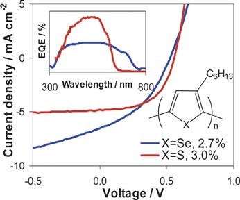 The study on regioregular poly(3-hexylselenophene) (P3HS) was conducted, which showed P3HS to be a promising electron-donating polymer for photovoltaics. P3HS shows a tendency to crystallize, particularly upon annealing, like a poly(3-hexythiophene) (P3HT). The comparable HOMO levels leads to a similar Voc for P3HS:PCBM (phenyl-C61-butyric acid methyl ester) to that found for P3HT:PCBM devices, but the smaller optical gap of P3HS leads to a more pronounced absorption in the red for P3HS:PCBM. A P3HS:PCBM device with an optimized film thickness and composition, and that was annealed at an optimized temperature at 150°C produced a PCE of 2.7%, close to that of P3HT:PCBM device measured under the same conditions. There is still space for further optimization, particularly with respect to improving the morphology to enhance the charge separation efficiency, charge transport, and fill factor.