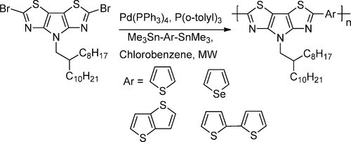 The synthesis of a novel electron-deficient fused pyrrolo[3,2-d:4,5-d′]bisthiazole is reported from 2-bromothiazole. This was copolymerized with thiophene, selenophene, thienothiophene, and bithiophene by microwave-assisted Stille polycondensation. The resulting polymers exhibited small optical band gaps combined with low-lying HOMO energy levels and demonstrated semiconducting behavior in organic field effect transistors.