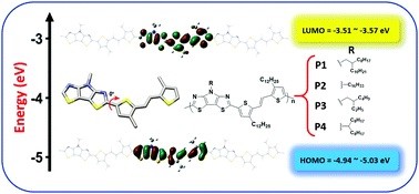 New low band gap copolymers P1–P4, based on thienylenevinylene (TV) and pyrrolo[3,2-d:4,5-d′]bisthiazole (PBTz) units composed of different alkyl side chains, such as 2-octyldodecyl (OD), n-hexadecyl (HD), 2-ethylhexyl (EH), and 9-heptadecyl (HD) groups, respectively, have been synthesized and characterized. Electrochemical and optical studies of the copolymers indicated low energy band gaps in the range of 1.40–1.47 eV. Moreover, theoretical calculation with density functional theory (DFT) and time-dependent DFT calculations demonstrated that the energy band gaps, HOMO energy levels and maximum absorption values in the copolymers were in good agreement with the experimental results. The decomposition temperature of all copolymers was measured to be above 340 °C by thermogravimetric analysis (TGA), which indicates high thermal stability. Thermally annealed OTFT devices based on P1–P4 thin films demonstrated a range of hole mobilities; thus, the P2 based OTFT device exhibited the highest hole mobility of 0.062 cm2 V−1 s−1.