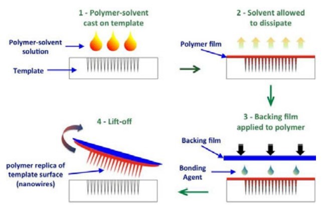 We report on the preparation of conjugated polymer nanofibers via template-synthesis. A femtosecond laser machined fused silica template, with a micro-patterned array of high-aspect ratio surface nanopores, was first spin-coated with a polyvinyl alcohol (PVA) solution to form a water-soluble release layer. The PVA-lined template was then coated with a conjugated poly(3-hexylselenophene) (P3HS) – solvent solution. The solvent was allowed to dissipate, and the resulting (template / PVA liner / conjugated P3HS film) stack was then submerged in water to dissolve the PVA and release the conjugated polymer film from the template. The resulting conjugated polymer film exhibits an array of micro-patterned polymer nanofibers that constitute a negative replica of the PVA-lined template. The nanofibers come arranged in a vertical architecture that spans over the surface of the supporting film.