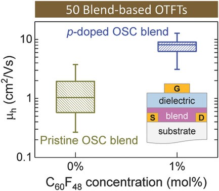 Molecular doping is a powerful tool with the potential to resolve many of the issues currently preventing organic thin-film transistor (OTFT) commercialization. However, the addition of dopant molecules into organic semiconductors often disrupts the host lattice, introducing defects and harming electrical transport. New dopant-based systems that overcome practical utilization issues, while still reaping the electrical performance benefits, would therefore be extremely valuable. Here, the impact of p-doping on the charge transport in blends consisting of the small-molecule 2,7-dioctyl[1]benzothieno[3,2-b][1]benzothiophene (C8-BTBT), the polymer indacenodithiophene-benzothiadiazole (C16IDT-BT), and the molecular dopant C60F48 is investigated. Electrical field-effect measurements indicate that p-doping not only enhances the average saturation mobility from 1.4 to 7.8 cm2 V−1 s−1 over 50 devices (maximum values from around 4 to 13 cm2 V−1 s−1), but also improves bias–stress stability, contact resistance, threshold voltage, and the overall device-to-device performance variation. Importantly, materials characterization using X-ray diffraction, X-ray photoemission spectroscopy, and ultraviolet photoemission spectroscopy, combined with charge transport modeling, reveal that effective doping is achieved without perturbing the microstructure of the polycrystalline semiconductor film. This work highlights the remarkable potential of ternary organic blends as a simple platform for OTFTs to achieve all the benefits of doping, with none of the drawbacks.