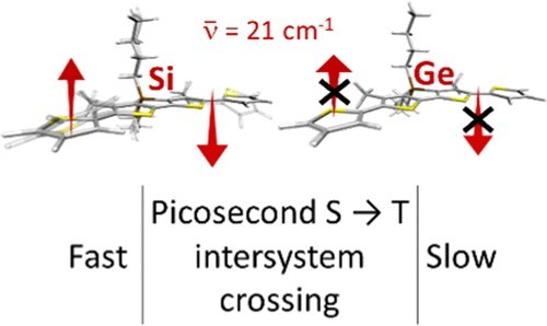 The effect of incorporating Si and Ge atoms in the conjugated backbone of semiconductor polymers is investigated using transient absorption spectroscopy and quantum chemical calculations to uncover the heavy-atom impact on the excited-state dynamics in neat films and polymer/fullerene blends. The singlet and triplet exciton dynamics of the copolymers are resolved and the time constant of intersystem crossing (ISC) of dithienosilole is found to be 6.98 ± 0.45 ps and nearly 4 times longer than that of dithienogermole. This result indicates that factors other than the heavy-atom effect govern the ISC rates and the overall excited-state dynamics in the copolymers. Our quantum chemical calculations and estimates of the ISC rates based on the semiclassical derivation for the electron-transfer processes in the nonadiabatic limit reveal that the main driver for the increased ISC time constant in BuSiDT is the reduction in planarity and increased torsional out-of-plane vibration of the Si-bridged thiophenes in the dithienosilole compared to the dithienogermole, leading to 8.3 times higher spin–orbit coupling and consequently a higher ISC rate. In the polymer/fullerene blends, charge generation yields are estimated. The results from this study indicate that the incorporation of heavy atoms in a bridge position within the conjugated polymer backbone can be used as a synthetic strategy to fine-tune excited-state properties.