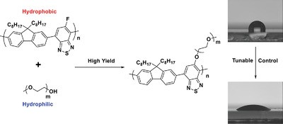 A facile method to prepare hydrophilic polymers by a postpolymerization nucleophillic aromatic substitution reaction of fluoride on an emissive conjugated polymer (CP) backbone is reported. Quantitative functionalization by a series of monofunctionalized ethylene glycol oligomers, from dimer to hexamer, as well as with high molecular weight polyethylene glycol is demonstrated. The length of the ethylene glycol sidechains is shown to have a direct impact on the surface wettability of the polymer, as well as its solubility in polar solvents. However, the energetics and band gap of the CPs remain essentially constant. This method therefore allows an easy way to modulate the wettability and solubility of CP materials for a diverse series of applications.