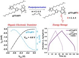 Functionalized polymeric mixed ionic–electronic conductors (PMIECs) are highly desired for the development of electrochemical applications, yet are hindered by the limited conventional synthesis techniques. Here, we propose a “graft-onto-polymer” synthesis strategy by post-polymerization functionalization (GOP-PPF) to prepare a family of PMIECs sharing the same backbone while functionalized with varying ethylene glycol (EG) compositions (two, four, and six EG repeating units). Unlike the typical procedure, GOP-PPF uses a nucleophilic aromatic substitution reaction for the facile and versatile attachment of functional units to a pre-synthesized conjugated-polymer precursor. Importantly, these redox-active PMIECs are investigated as a platform for energy storage devices and organic electrochemical transistors (OECTs) in aqueous media. The ion diffusivity, charge mobility and charge-storage capacity can be significantly improved by optimizing the EG composition. Specifically, g2T2-gBT6 containing the highest EG density gives the highest charge-storage capacity exceeding 180 F g−1 among the polymer series, resulting from the improved ion diffusivity. Moreover, g2T2-gBT4 with four EG repeating units exhibits a superior performance compared to its two analogues in OECTs, associated with a high μC* up to 359 F V−1 cm−1 s−1, owing to the optimal balance between ionic–electronic coupling and charge mobility. Through the GOP-PPF, PMIECs can be tailored to access desirable performance metrics at the molecular level.