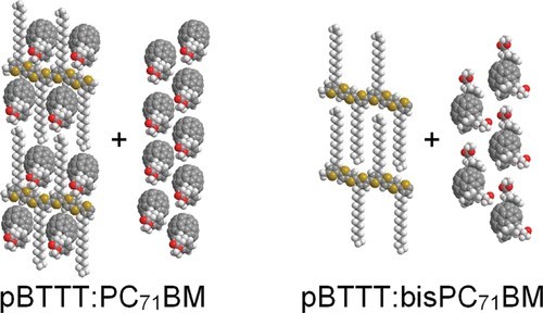 We demonstrate that intercalation of fullerene derivatives between the side chains of conjugated polymers can be controlled by adjusting the fullerene size and compare the properties of intercalated and nonintercalated poly(2,5-bis(3-hexadecylthiophen-2-yl)thieno[3,2-b]thiophene (pBTTT):fullerene blends. The intercalated blends, which exhibit optimal solar-cell performance at 1:4 polymer:fullerene by weight, have better photoluminescence quenching and lower absorption than the nonintercalated blends, which optimize at 1:1. Understanding how intercalation affects performance will enable more effective design of polymer:fullerene solar cells.