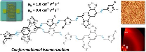 High charge carrier mobility in organic semiconductors is usually accomplished by its high crystallinity, yet, which, often leads to poor mechanical resilience, limiting their performance in flexible devices. In this work, a naphtho[1,2-c:5,6-c′]bis[1,2,5]thiadiazole (NT)-based polymer PNztDTV containing multiple vinyl linkages was reported, exhibiting excellent ambipolar OFET performance, with hole and electron mobility up to 1.0 (μh) and 0.4 (μe) cm2 V–1 s–1, respectively. The GIWAXS analysis revealed overall a rather weak crystallinity in its thin film, yet with considerably strong localized π–π intermolecular interaction. The simultaneous low crystallinity and high performance of PNztDTV imply promising potential in flexible electronics, which is presumably resulted by the isomerization of the vinylene linkage and π-expanded NT core.
